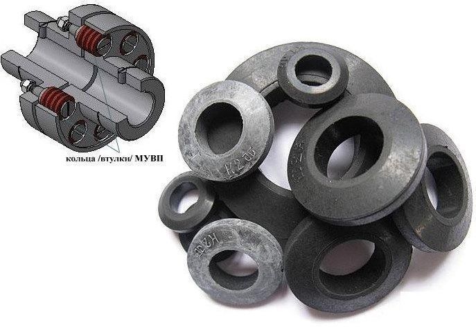 Кольца МУВП - применяются в МУВП (муфта упругая втулочно-пальцевая) в качестве демпфирующего элемента. Кольца МУВП изготавливаются из резины и полиуретана, предназначены для работы во втулочно-пальцевых муфтах при передаче крутящего момента, уменьшения динамических нагрузок, компенсации колебаний нагрузки.