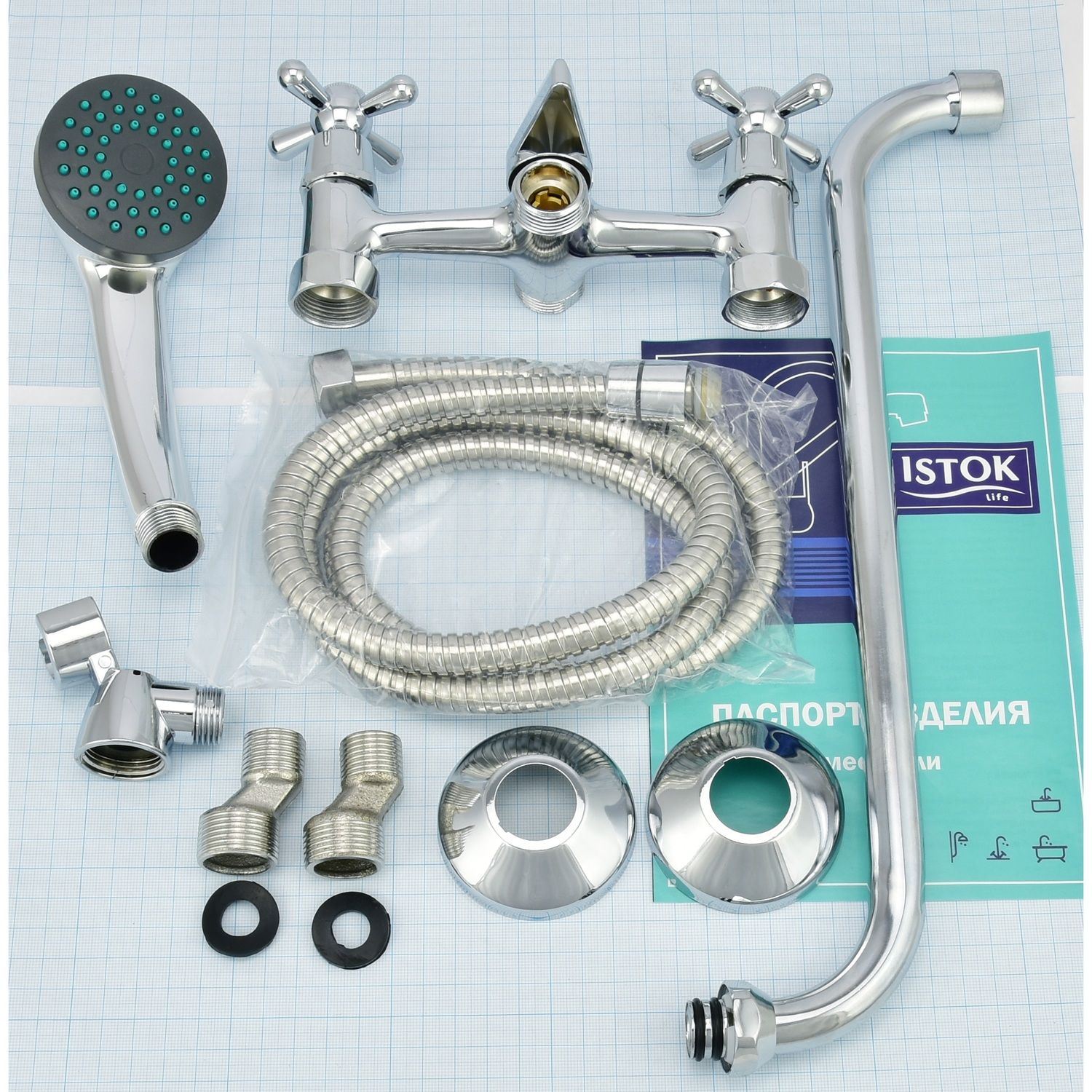Смеситель, шланг для душа, лейка для душа, эксцентрики, отражатели, паспорт