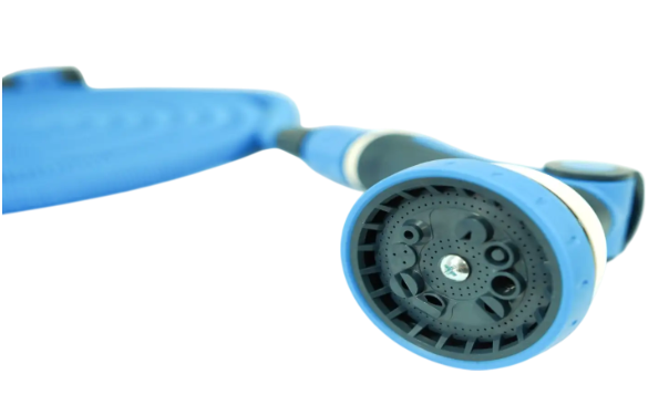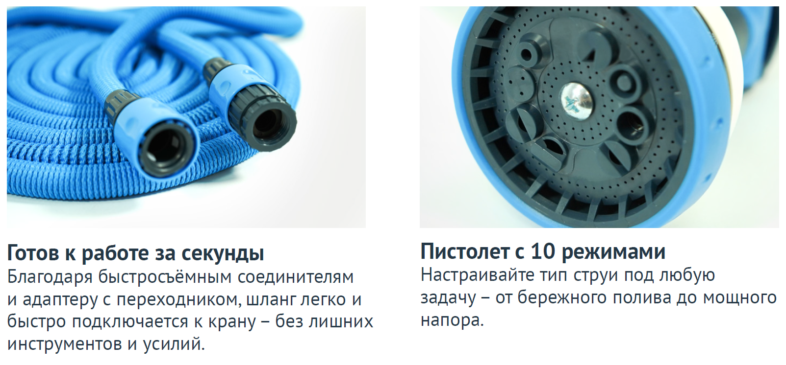 На концах шланга установлены быстросъёмные соединители: один подключается к распылителю с 10 режимами работы, другой — к крану через адаптер с резьбой 3/4" или 1/2". Под давлением воды шланг растягивается с 5 до 15 метров