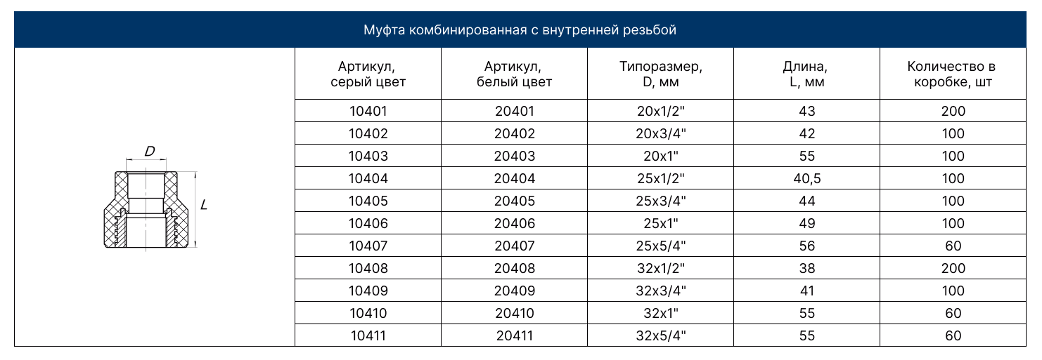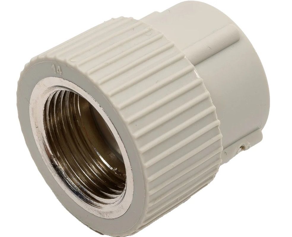 Муфта комбинированная применяется для соединения полипропиленового трубопровода с резьбовыми элементами трубопроводной арматуры, оборудования и т.п. выполненными из любых материалов