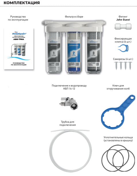 Модуль фильтрации в сборе с комплектом картриджей; Кран + тройник 1/2-1/4; Трубка для подключения; Ключ (Кран для чистой воды в комплект не входит)