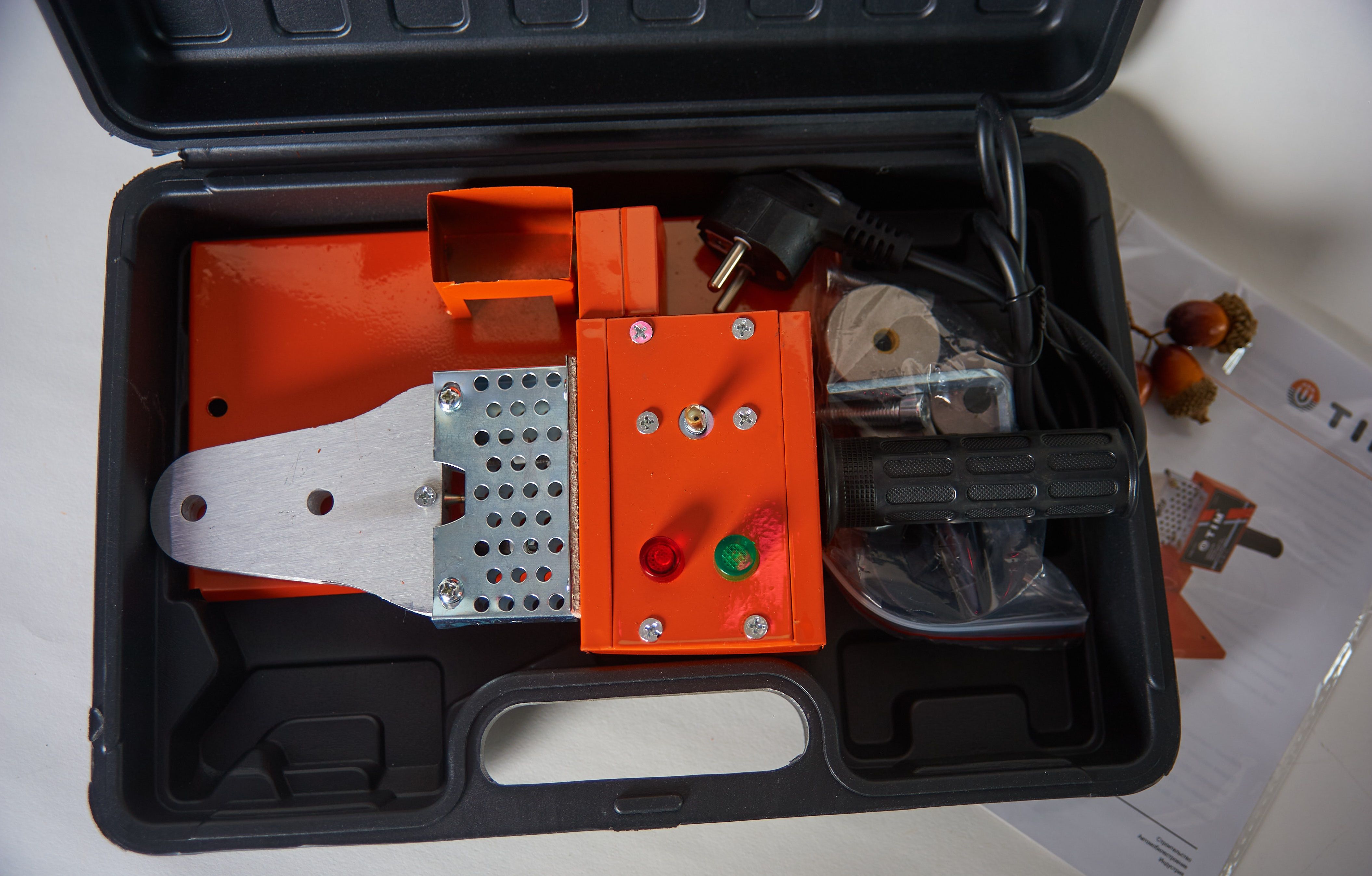 В комплекте: плоский паяльник мощностью 600Вт (2 отверстия для насадок), подставка, труборез, уровень, отвертка, шестигранный ключ, рулетка 3м, насадки - 20, 25, 32.